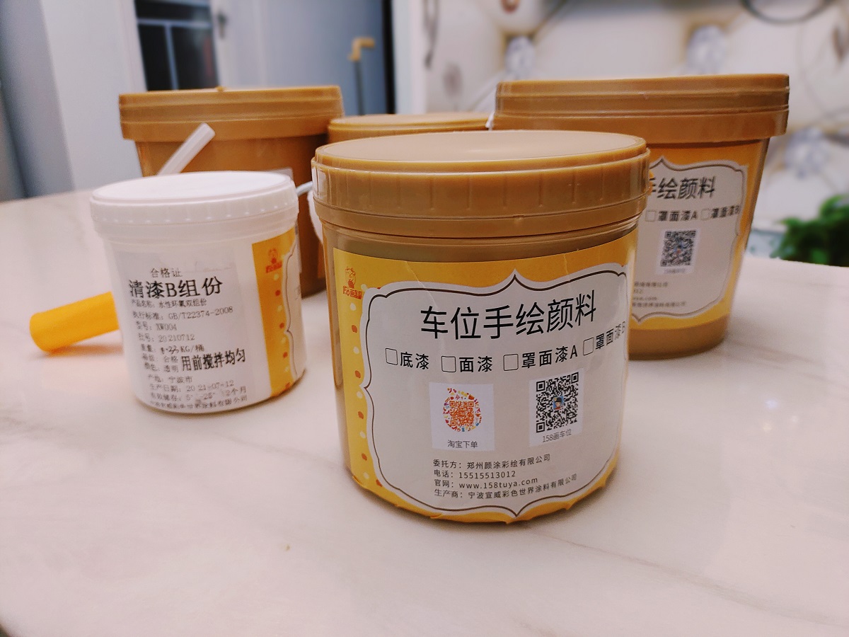 除了面漆颜料之外,进行车位彩绘的工作,还需要搭配抗碱封闭底漆和双组份清漆,以保证整体的防潮效果和耐磨性能,我们下面会介绍到。